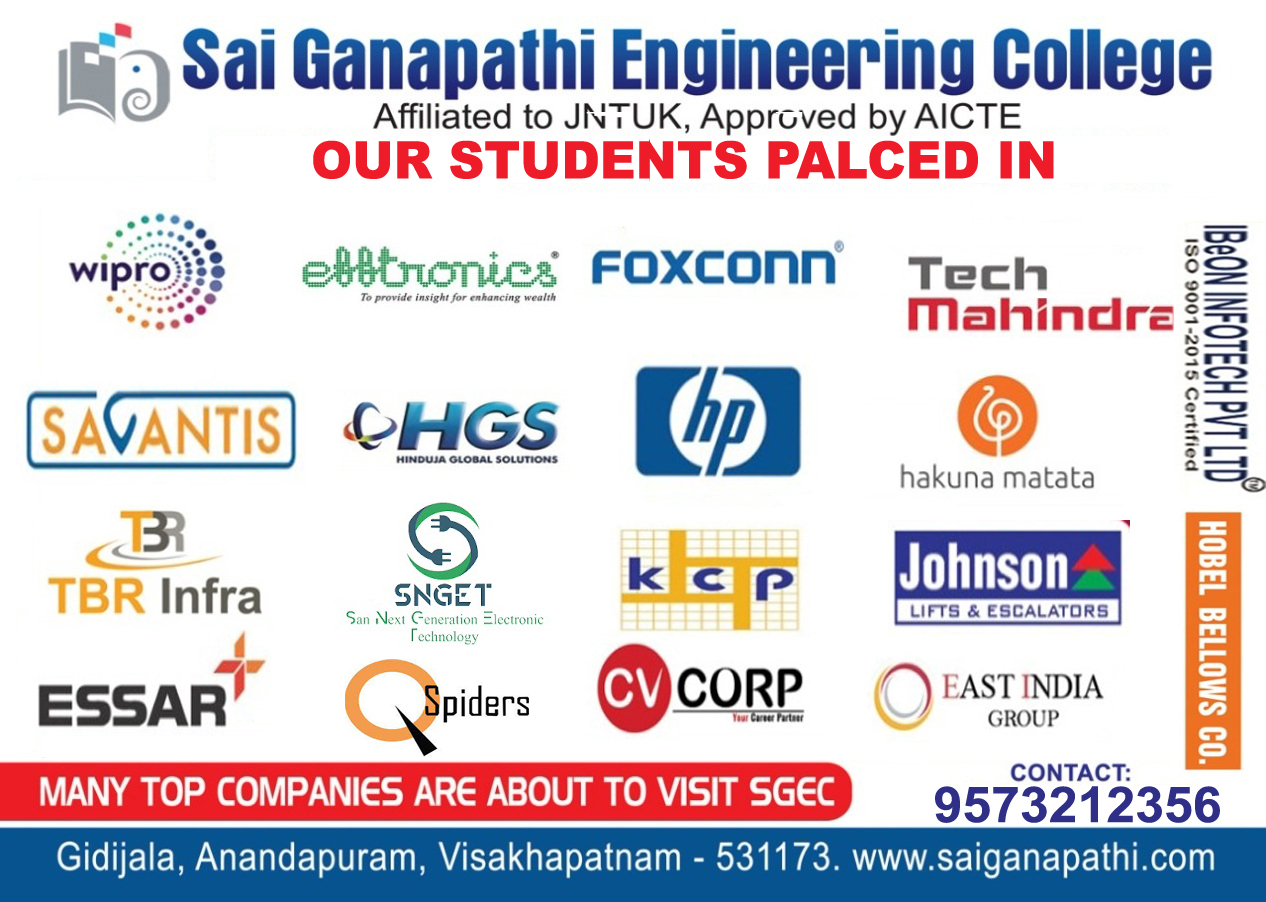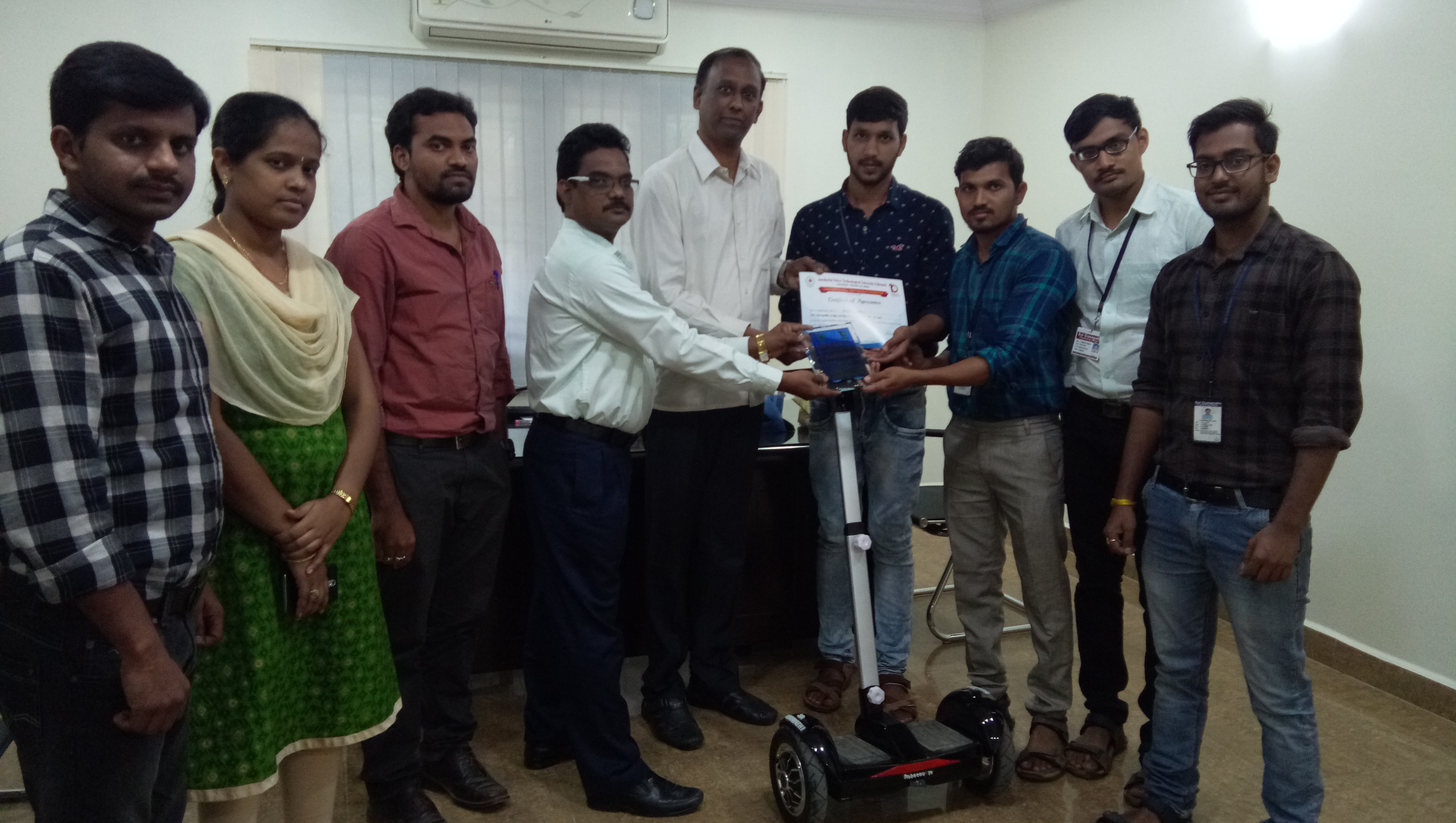 Sai Ganapathi Engineering Students have won the 1st Prize with Cash Reward for their Project work "SEGWAY" in Decennial Celebrations held for 198 Engineering Colleges in JNTU, KAKINADA. This is a Live Project completely done by Sai Ganapathi Engineering Students under the guidance of Principal sir and EEE and Mechanical Staff. |