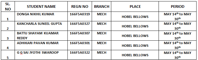 The Students done the internship in the "HOBEL BELLOWS" industry on May 14th to May 30th 2021 |